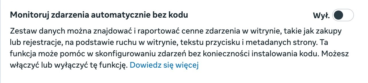 4. Do prawidłowego działania piksela rekomendujemy wyłączenie opcji „Monitoruj zdarzenia automatycznie bez kodu” w ustawieniach narzędzia Meta Pixel.