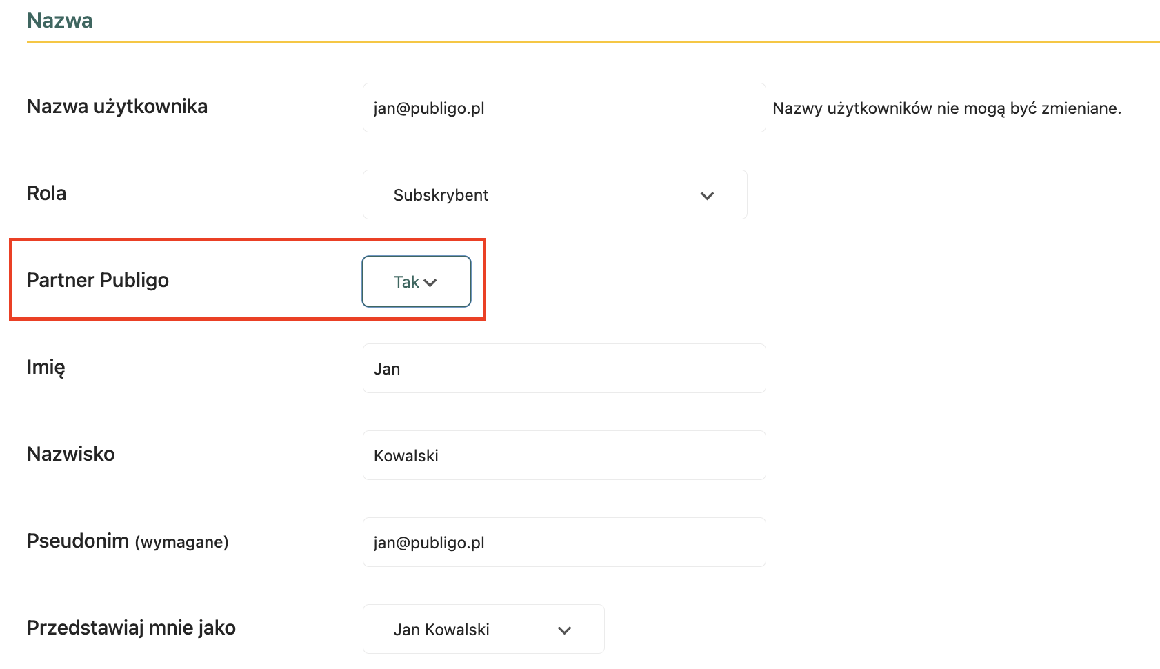 - W sekcji Partner Publigo zmień na "Tak"