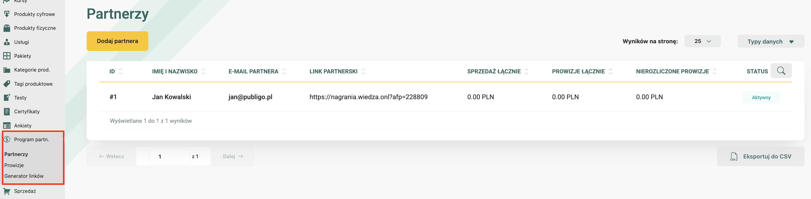 - Program partnerski umożliwia stworzenie konta dla partnera (lub przypisanie jako Partner Publigo do istniejącego już konta użytkownika).
