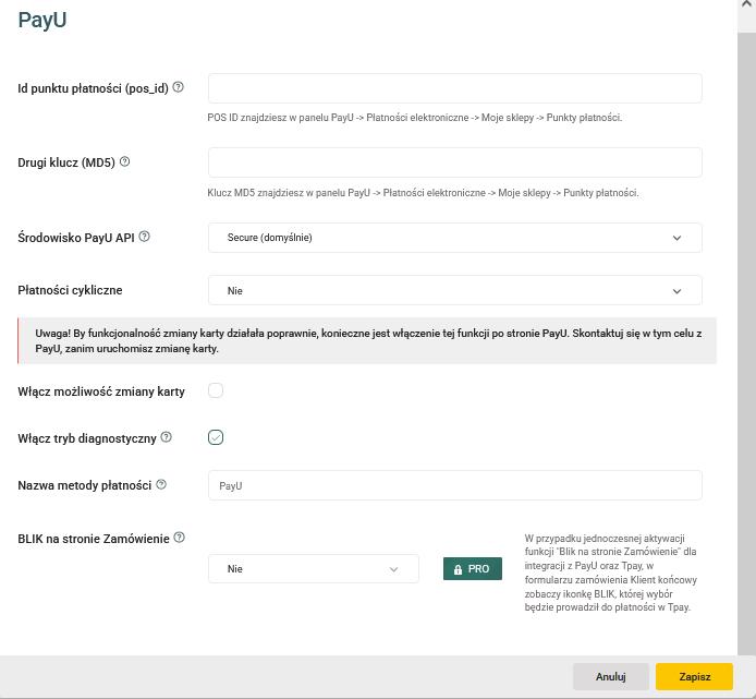 Do prawidłowego działania płatności wystarczy uzupełnić pole: Id punktu płatności (pos_id) i Drugi klucz (MD5), pozostałe pola zostawiamy puste.