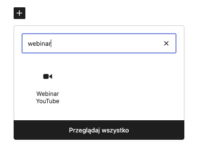 - W edytorze lekcji lub strony w Publigo kliknij Dodaj blok → Webinar YouTube.