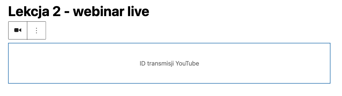 Blok webinaru YouTube pozwala osadzić na stronie lekcji lub kursu transmisję live prowadzoną w YouTube. Dzięki temu kursanci mogą uczestniczyć w wydarzeniu bezpośrednio w Publigo, bez przechodzenia na inne strony.