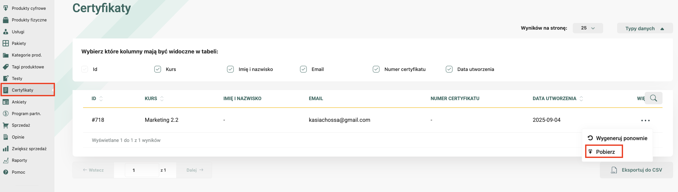 Aby pobrać certyfikat, wybierz w kolumnie trzy kropki przy wybranym wierszu, a następnie kliknij „Pobierz”.