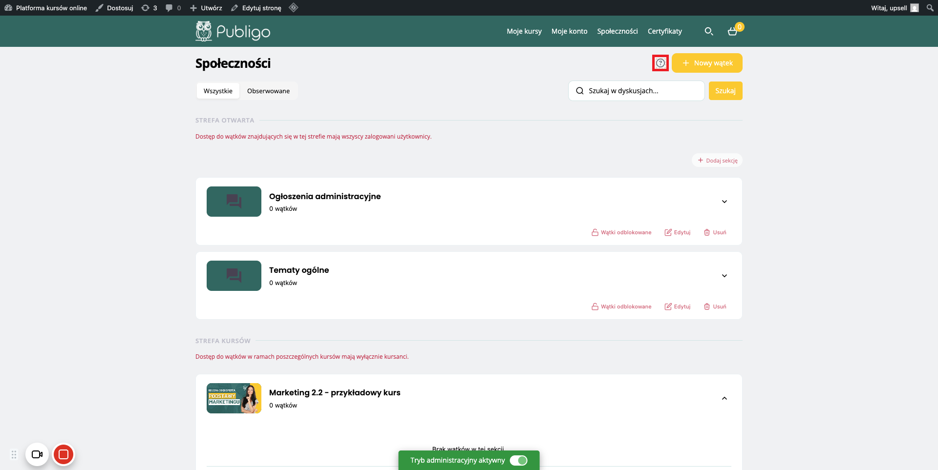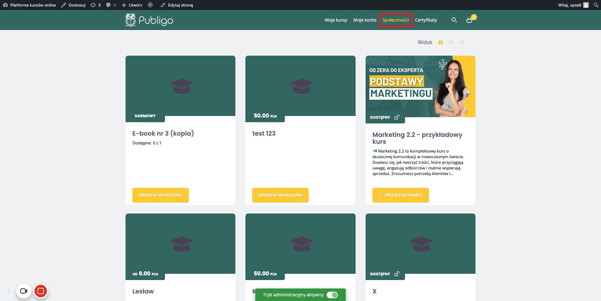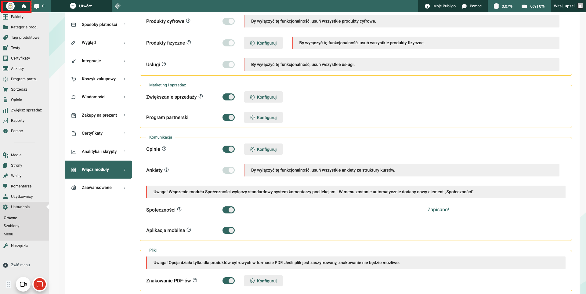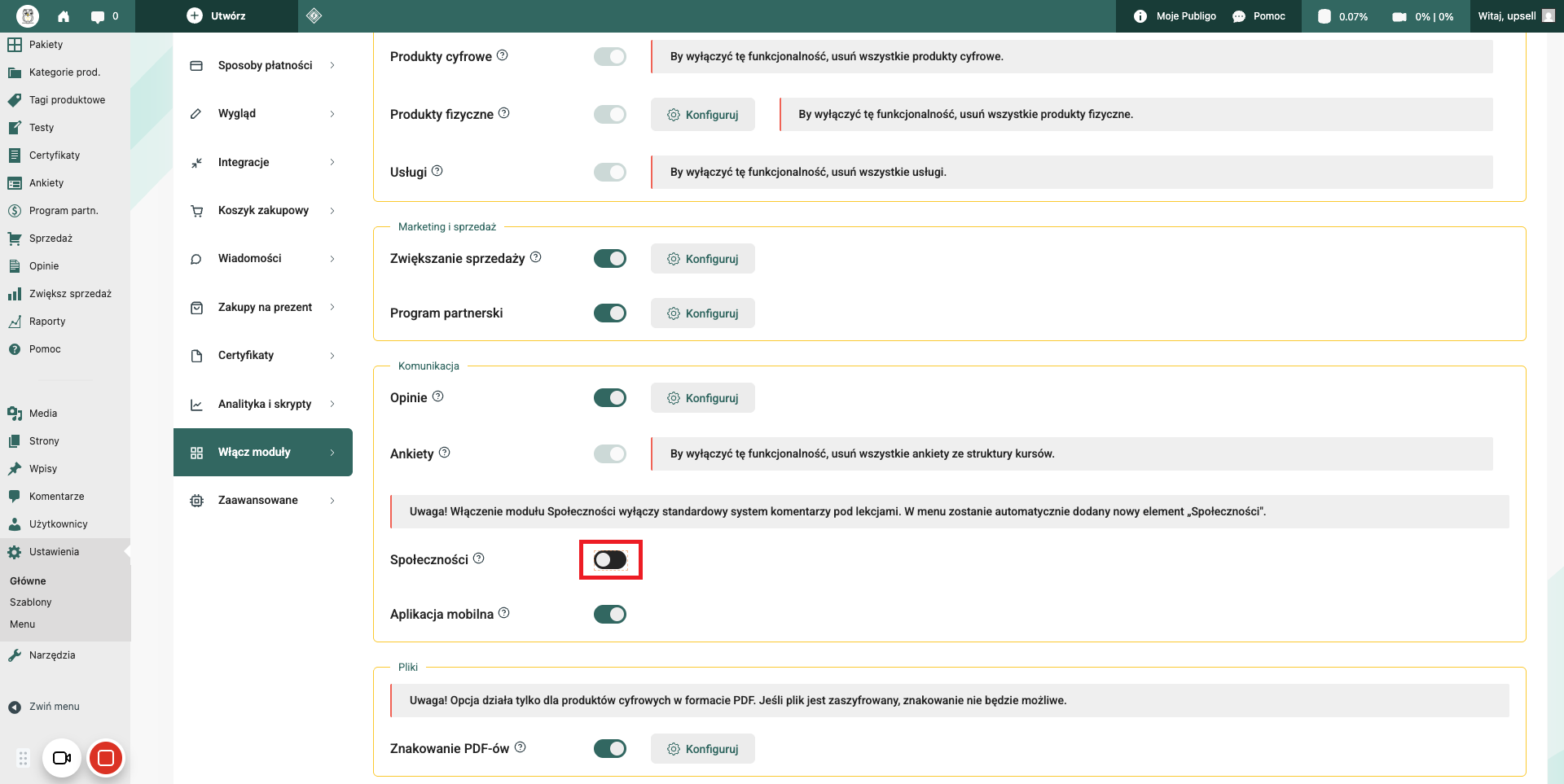 Krok 3 - Włącz moduł Społeczności, klikając w suwak znajdujący się obok nazwy Społeczności.