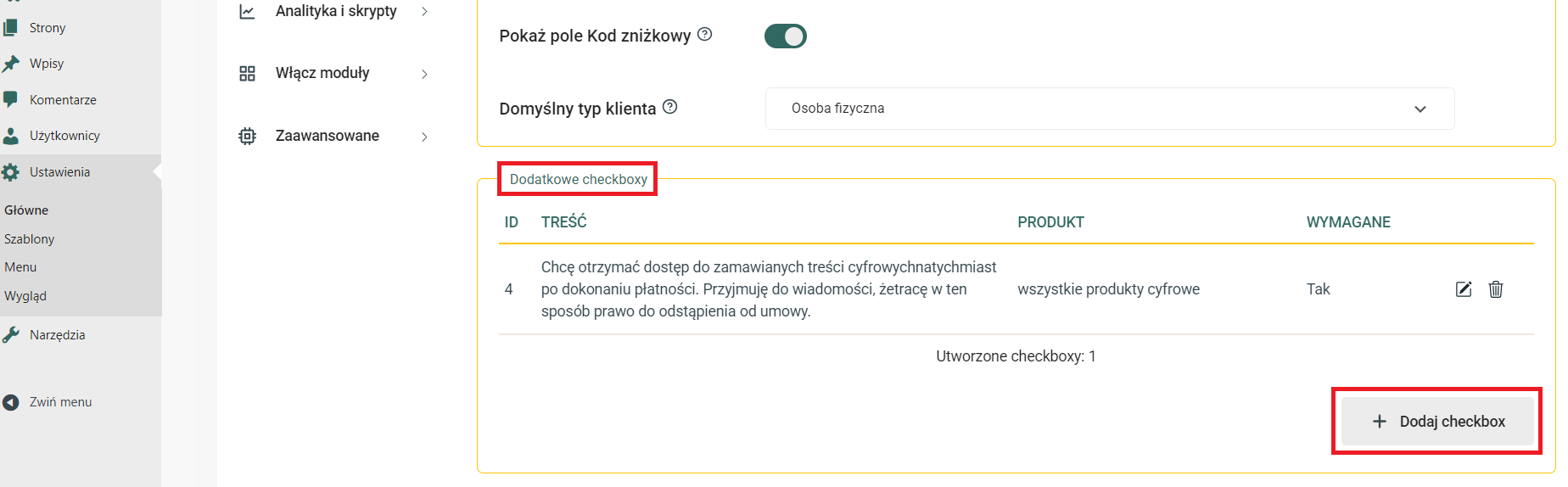 Pamiętaj!Możesz tworzyć różne checkboxy dla różnych produktów - to idealne rozwiązanie, jeśli sprzedajesz np. kurs i konsultację, które wymagają osobnych akceptacji. Wszystkie utworzone checkboxy widzisz na liście głównej, gdzie możesz je w dowolnej chwili edytować lub usunąć.