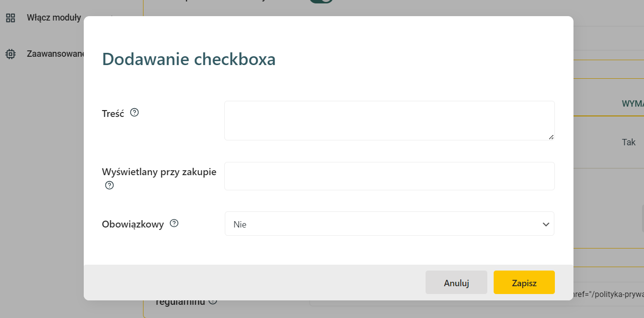 Obowiązkowy: Wybierz „Tak”, jeśli klient musi zaznaczyć to pole, aby sfinalizować zakup. Wybierz „Nie”, jeśli zaznaczenie ma być dobrowolne.